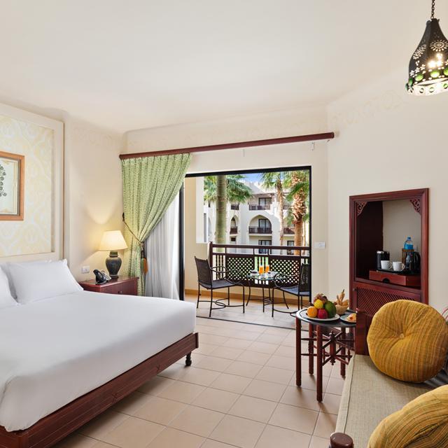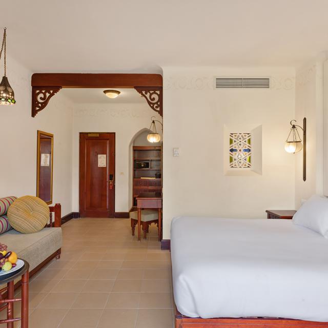 Het elegante hotel is gebouwd met Arabische invloeden. Zo zie je in het interieur veel sierlijke bogen, kleurrijke kussentjes en zijn er verschillende plekken om sisha (waterpijp) te roken. Ook de moderne kamers hebben een Arabische twist. Daarnaast zijn ze voorzien van allerlei fijne faciliteiten, zoals een minibar, televisie, waterkoker en een balkon of terras met zitje.