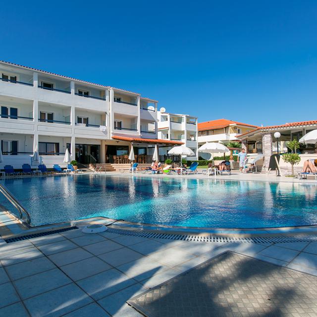 Wil je zwemmen in het zwembad, of toch liever in de zee? Doordat het allemaal in de buurt ligt, kun je het hier zelfs afwisselen. Rondom het zwembad staan comfortabele ligbedjes en parasols waar je als gast gratis gebruik van kan maken. Bij de ruime poolbar, kun je zowel overdag als ’s avonds een lekkere maaltijd bestellen en de sfeer is hier heel gezellig.
