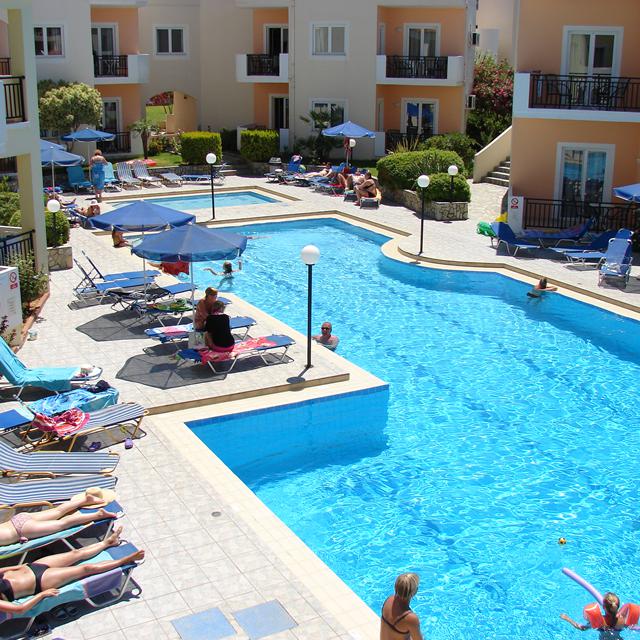 De dag doorbrengen bij het zwembad op een ligbedje is een aanrader. Lekker relaxen en even helemaal niets doen. Tijdens happy hour bestel je een leuke cocktail en voor de lekkere trek is er een kleine menukaart. In de eenvoudige, maar nette appartementen, maak je in de kitchenette een eenvoudige maaltijd klaar. Geen zin om te koken tijdens je vakantie? Probeer dan de diverse Griekse restaurantjes in de directe omgeving.