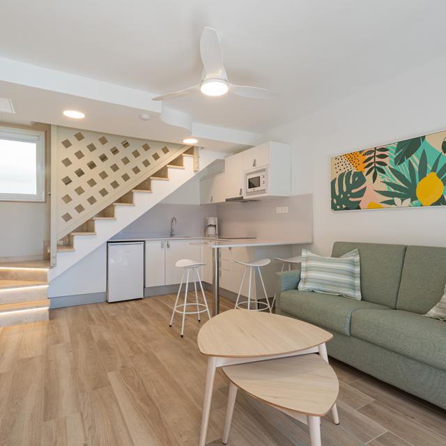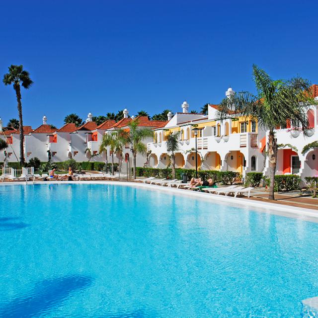 Tussen de wuivende palmbomen en fleurige bloemen en direct naast de golfbaan van Maspalomas vind je de kleurrijke Bungalows Cordial Green Golf. Het mooie zandstrand ligt op 1,5 kilometer afstand.
