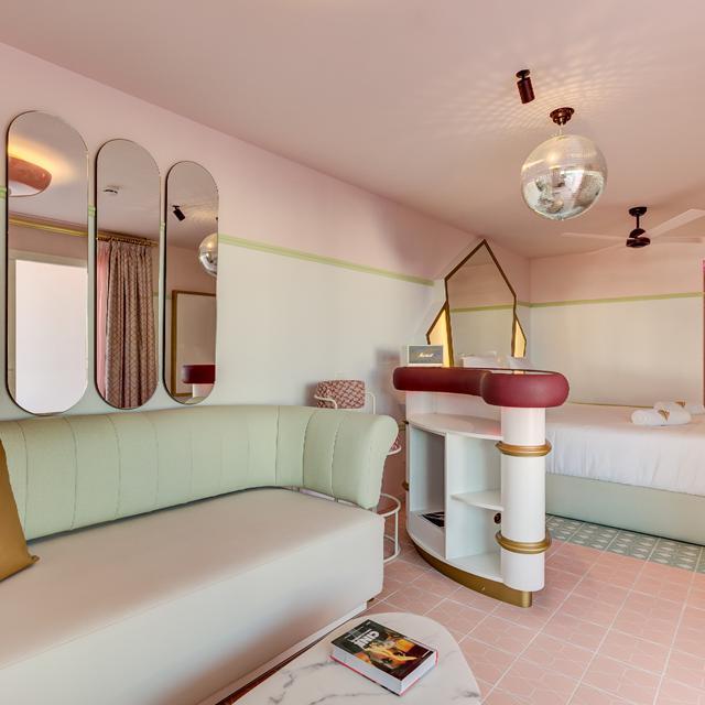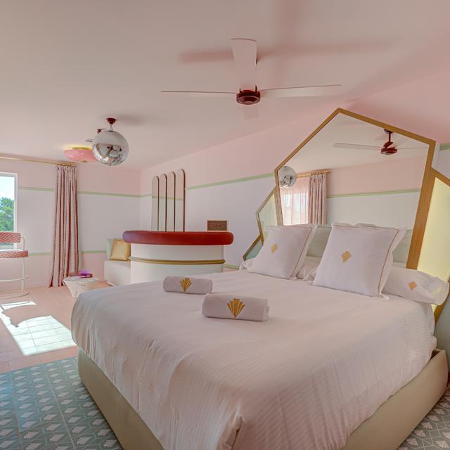 Een roze Cadillac als jacuzzi, een discobal in je kamer en spiegels achter het bed, hotel Grand Paradiso Ibiza is op zijn zachtst gezegd bijzonder. Dit te gekke vakantieadres in San Antonio Bahia is geïnspireerd door Amerika uit de jaren 80 en heeft een echte Hollywood vibe.