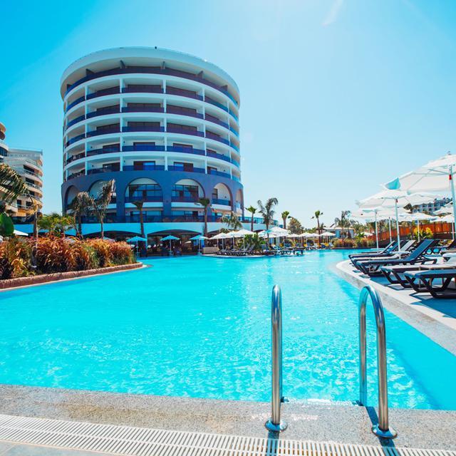 In het Turkse Manavgat vind je het vijfsterren Hotel Alarcha Resorts. Dit hotel straalt op en top luxe uit en heeft een fijne ligging. Je wandelt binnen een paar minuten naar het privéstrand, waar de ligbedden voor je klaarstaan. Zin om een frisse duik in het zwembad te nemen? Ook dat is geen probleem. Je vindt er twee zwembaden, eentje binnen en eentje buiten. Aan de kleintjes is ook gedacht: in het kinderbad koelen zij lekker af en er is een mini club en speeltuin. En voor de echte waterratten is er een kleurrijk waterpark met verschillende (uitdagende) glijbanen.