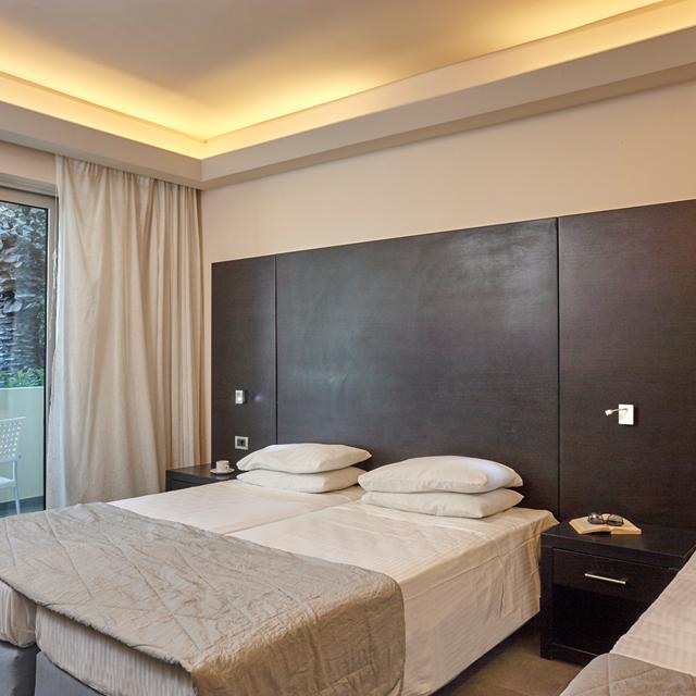 De ruime hotelkamers, met grote balkondeuren die leiden naar het balkon of terras, zijn zeer comfortabel en zijn van alle gemakken voorzien. Je kijkt uit over de prachtige bloementuin, het bergachtige landschap of over de blauwe zee. Ben je helemaal uitgerust, dan heb je vast trek gekregen in een lekkere maaltijd. Je kunt iedere dag weer kiezen uit de royale buffetten geïnspireerd op de Griekse en mediterrane keuken.