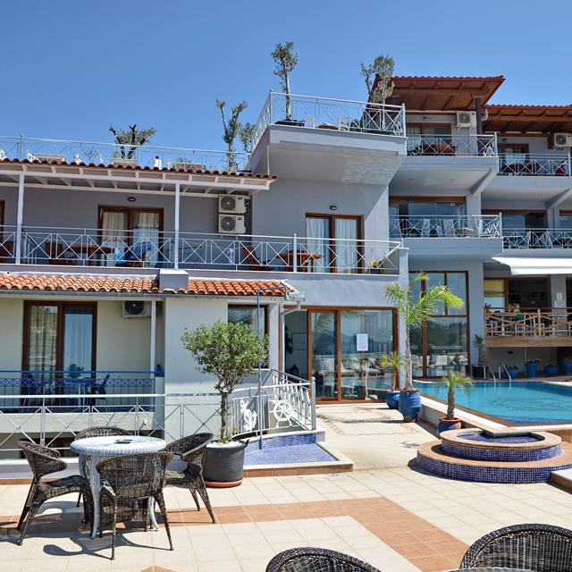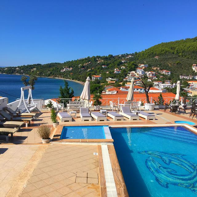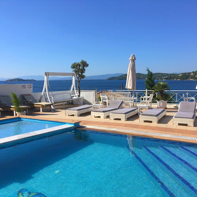 Aan de rand van het zwembad is het ook heerlijk vertoeven. Er staan ligbedjes met parasols en vanaf het terras heb je een prachtig uitzicht over de hele omgeving. Net een ansichtkaart! Hotel Aria is een prima uitvalsbasis om Skiathos te ontdekken. Fijne vakantie!