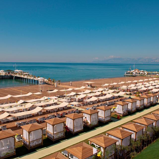Pal voor de deur van het luxueuze Hotel Delphin Imperial ligt het goudgele Lara-strand met een azuurblauwe zee. Het stadscentrum van Antalya is hier vandaan eenvoudig te bereiken met de stadsbus.