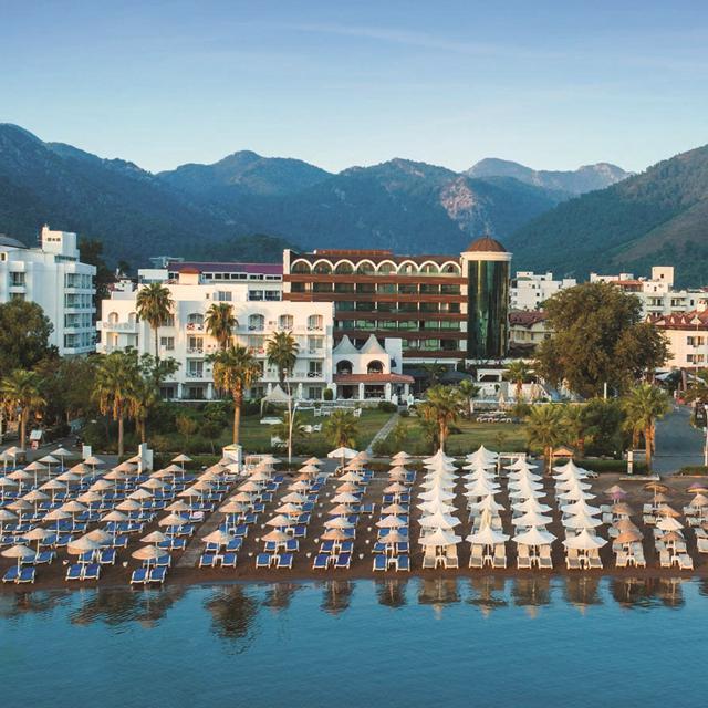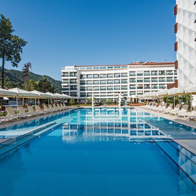 Het chique Hotel Elite World Marmaris ligt in het knusse centrum van Içmeler, na slechts een paar stappen kun je hier het zand al onder je voeten voelen. Terwijl het hotel een rustige ligging heeft, kun je met de dolmus (een kleine bus) toch binnen de kortste tijd in het bruisende centrum van Marmaris staan. Het hotel doet zijn naam eer aan, door een uitstekende service te bieden. De kamers zijn stijlvol en modern ingericht, evenals de mooie restaurants en bars. Bij de Palm Bar kun je aan het zwembad van de lekkerste cocktails en snacks genieten, terwijl je lekker in het zonnetje zit. Voor iedereen die in shape wil blijven tijdens de vakantie is er het Fit Life wellnesscenter. Zo kun je je daar uitleven in het fitnesscenter om je vervolgens in de watten te laten leggen tijdens een heerlijke massage, om af te sluiten met een gezond sapje van de Vitamin Bar.