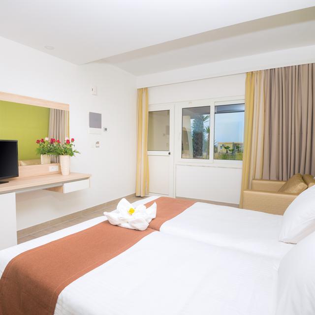 Er zijn verschillende kamterypes te reserveren en ook familiekamers. Deze zijn netjes, maar eenvoudig ingericht en er is zelfs een aparte slaapkamer. Alle maaltijden, lekkere hapjes tussendoor zijn inclusief. Elke dag staan er weer heerlijke buffetten voor je klaar geïnspireerd op de Griekse en mediterrane keuken. Voor alle drankjes kun je terecht bij de beachbar of bij de poolbar.