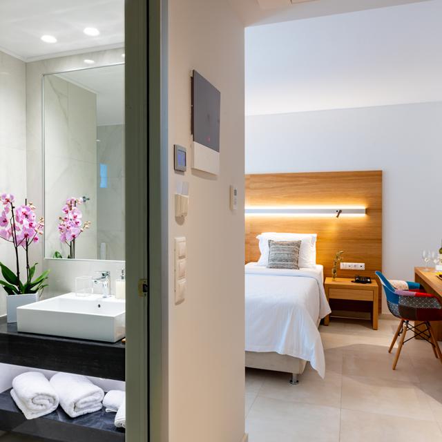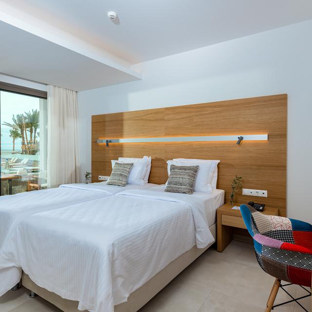 De hotelkamers geven je het ultieme gevoel van luxe en hebben een fijn balkon of terras met een schuin uitzicht over zee (zeezichtkamers) of het zwembad. In het restaurant Estia worden culinaire maaltijden geserveerd. Dit zijn bijzondere gerechten die samengesteld worden met verse lokale producten, heerlijk! Geniet na het diner in de nieuwe Elia loungebar van een kopje koffie of lekkere cocktail. Het panoramisch uitzicht is hier fantastisch en terwijl je de zon langzaam in zee ziet zakken, proost je op een fantastische vakantie!