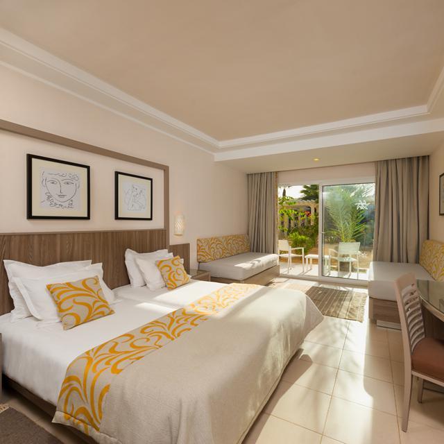 De kamers zijn ruim en licht. Ze bieden een prachtig uitzicht op de tuin, het zwembad of de zee. Heel fijn om hier te kunnen ontspannen na een dag onder de Tunesische zon.