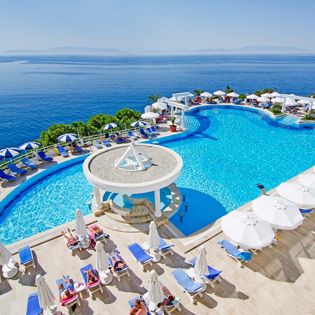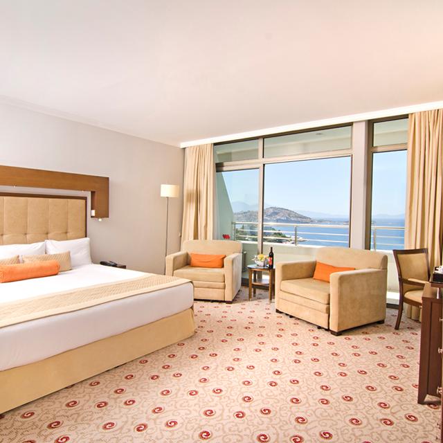 De kamers zijn allemaal verzorgd ingericht met lichte kleuren en houten accenten en hebben allemaal een fijn balkon. Vanaf het terras om het zwembad heen heb je een mooi uitzicht over zee. Ook in veel van de restaurants en bars is het uitzicht waanzinnig. Zo is er het Manzara restaurant waar de zonsondergang prachtig is en ligt de Sedir bar op de rots met een adembenemend uitzicht over Kusadasi.