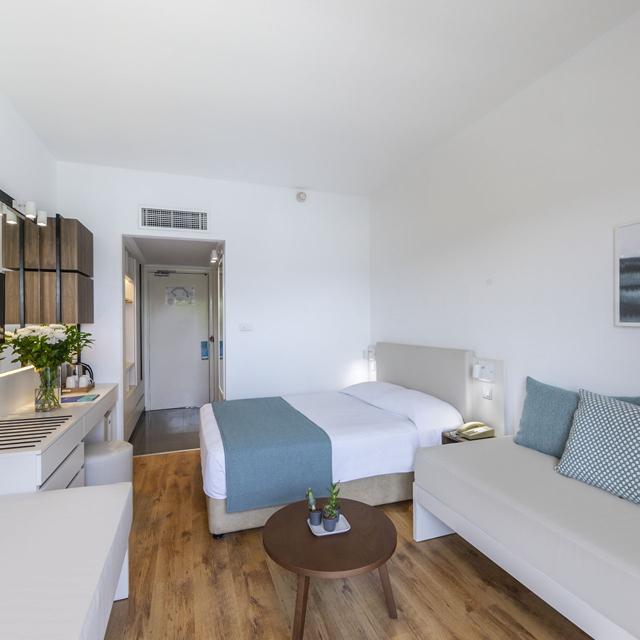 Louis Phaethon Beach beschikt over standard kamers: 2-persoons- en familiekamers met uitzicht op de omgeving of zee. Ze zijn ingericht met moderne meubels in frisse, lichte kleuren en beschikken over een koelkast, televisie, airconditioning en een fijn terras. Het hotel is voor zowel stellen als families een heerlijke plek voor een zonovergoten vakantie. Naast luieren aan het zwembad of op het strand, is er namelijk ook van alles te beleven. Zo is er een spectaculair waterpark met 6 stoere waterglijbanen en 2 zwembaden. Ook vind je hier allerlei sportmogelijkheden variërend van tennis tot beachvolleybal. Wie even heerlijk wilt ontspannen kan terrecht in de sauna, jacuzzi of stoombad.