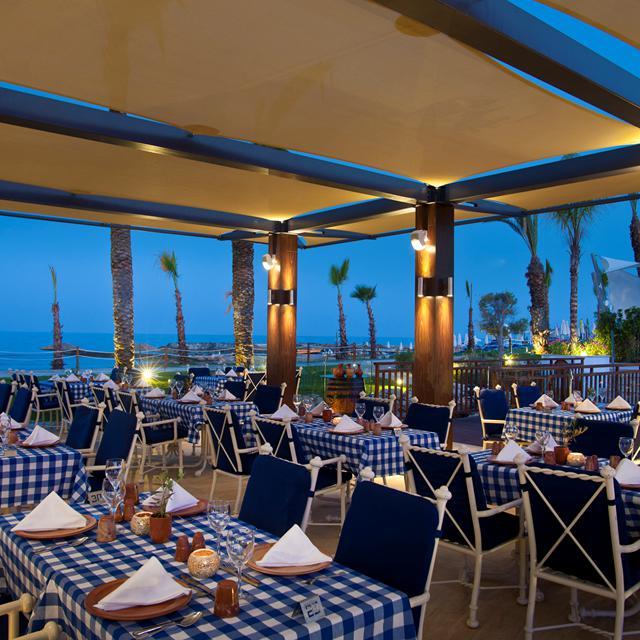 Op de lange lijst met faciliteiten staat er voor iedereen wel wat leuks tussen. Zo zijn er 5 zwembaden, meerdere tennisbanen, een tienerclub, een grote speeltuin en een luxe spa. Ook eten is in dit hotel een feestje: er zijn maar liefst 5 restaurants met diverse specialiteiten. Zo heeft het hoofdrestaurant iedere dag spannende themabuffetten, kun je in Captains Desk restaurant authentieke Cypriotische Mezes proberen en serveren ze teppanyaki- en Thaise gerechten in het Aziatische restaurant Seven Orchids.