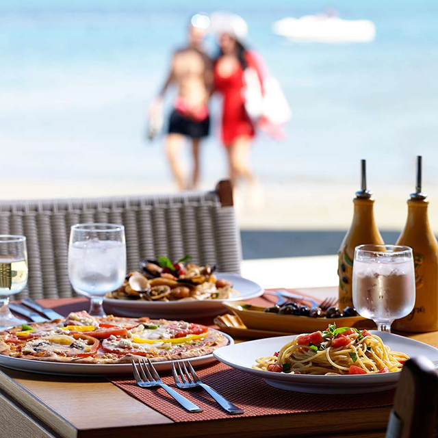 Je verblijft hier op basis van all inclusive en dat maakt je vakantie hier uiterst comfortabel. Je kan namelijk gewoon op je ligbed blijven liggen wanneer de kids zin hebben in een ijsje of een crêpe van de crêperie. Voor de lunch is er een souvlakitent, waar je heerlijk gemarineerde spiesjes kunt eten. Maar er is ook een hoofdrestaurant waar je van alles kunt uitproberen dat tijdens het buffet wordt gepresenteerd. Zin in een avondje Italiaans, Chinees of Grieks eten? Strijk dan neer in een van de themarestaurants en geniet van een wereldse keuken en uitzicht over zee.