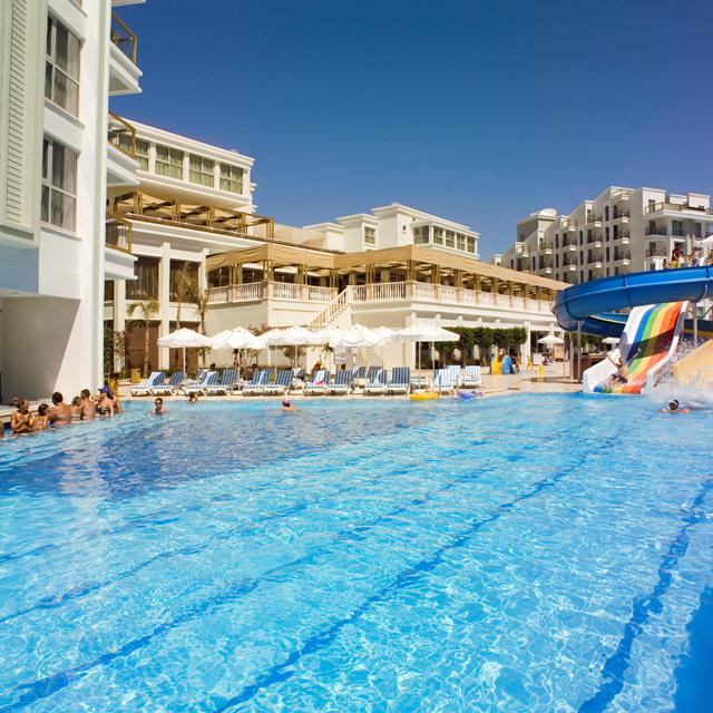 Hotel Royal Atlantis Spa & Resort in Side heeft alles wat je maar kan wensen. Dit hotel ligt pal aan het strand van Side en in de buurt van het hotel vind je leuke winkeltjes. Het complex is groots opgezet en ruimtelijk ingericht. Aan de achterzijde, grenzend aan zee is een groot zwembad met waterglijbanen. Verder beschikt het hotel over een hamam, jacuzzi, sauna en fitnessruimte. Ook is er een discotheek en een prachtig aangelegde tuin te vinden. In dit hotel verblijf je op basis van ultra all inclusive. Je gaat een zorgeloze vakantie tegemoet in Hotel Royal Atlantis Spa & Resort!