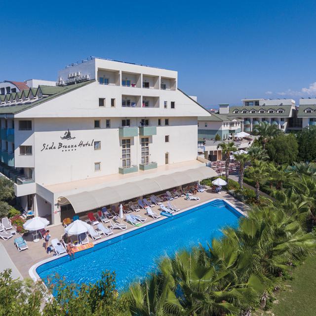 Hotel Side Breeze is een eenvoudig vijfsterrenhotel vlakbij een van de mooiste stranden van Side. Het strand met ligbedjes is 250 meter van het hotel vandaan. Het water ligt laag waardoor je ver moet lopen om kopje onder te gaan; ideaal voor kinderen of ouderen! Op het strand vind je ook een beachbar waar je een lekker verfrissend drankje kunt halen.