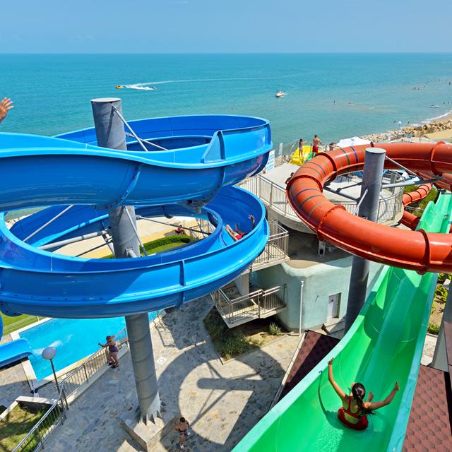 Dit is een ideaal hotel voor de echte waterratten onder ons. Er is een binnen- en een buitenbad en zelfs een aquapark met vrolijk gekleurde glijbanen. Om te ontspannen kun je een bezoek brengen aan het wellnesscentrum, terwijl de jongste reizigers zich vermaken in de kids club.