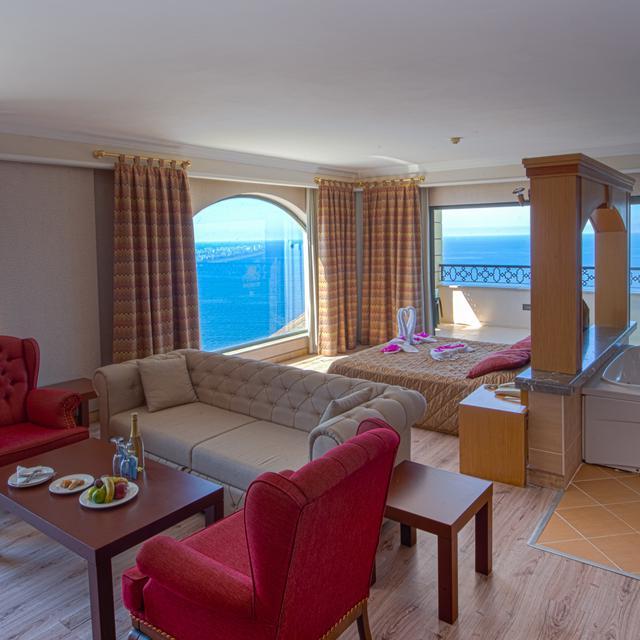 Het betoverende Hotel Utopia World is omgeven door veel groen en ligt boven op een heuvel aan de Middellandse zee. Het uitzicht vanaf het hotel is dan ook fenomenaal. Via een loopbrug en liften is het privéstrand makkelijk te bereiken. Voor een dagje of avondje uit in het gezellige centrum van Alanya kun je gebruik maken van de dolmus (het openbaarvervoer).