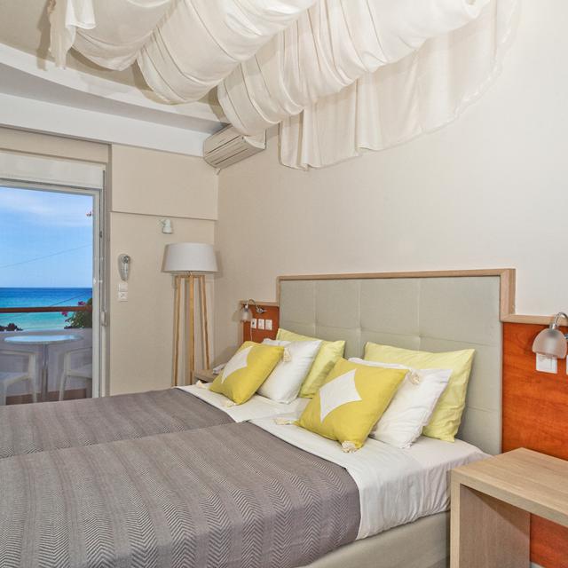 De sfeervolle hotelkamers liggen verspreid over vier kleurrijke gebouwen. Tussen de gebouwen in ligt het zwembad, waar de zonnebedjes er uitnodigend voor je bij staan. Met een heerlijk koel drankje van de poolbar is het hier wel erg goed vertoeven. Zowel het ontbijg als het diner zijn inbegrepen. Alle maaltijden worden door de eigenaar zelf klaar gemaakt met veel passie en liefde voor de Griekse keuken. Dat moet je proeven!